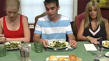 Busty MILF stepmom and her stepdaughter fucks with a guy